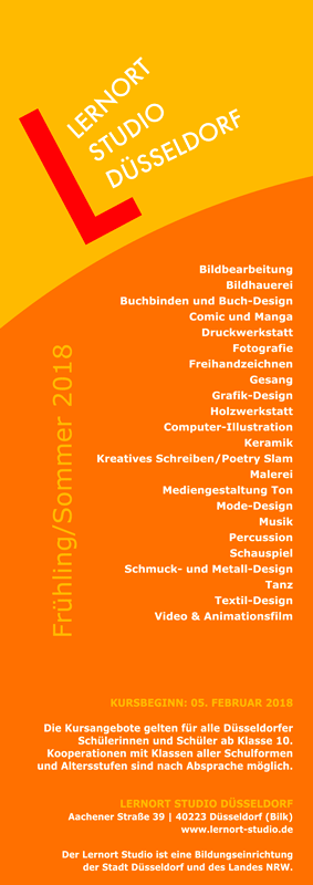 Der Lernort Studio ist eine Einrichtung des Landes NRW und der Landeshauptstadt Düsseldorf und bietet für alle Düsseldorfer Schülerinnen und Schüler ab der 10. Klasse offene Kurse an. Projekte mit Schulen und Bildungseinrichtungen sind –nach Absprache– möglich.