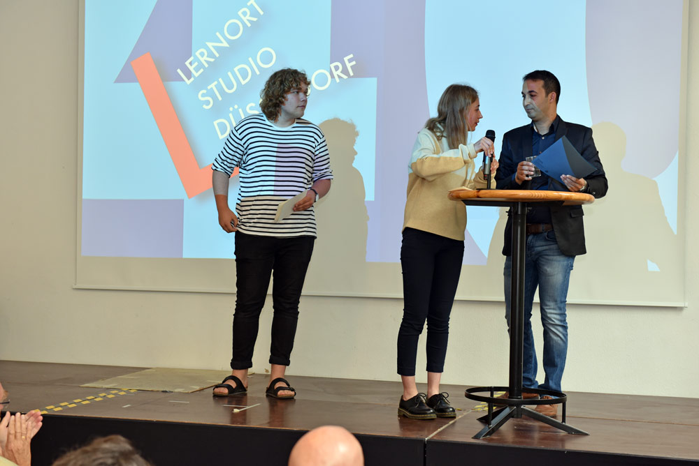 Lars Unkenholz u. Paula Breuer (ModeratorInnen) und Farid Izaamriouane (Leiter Lernort Studio Düsseldorf)